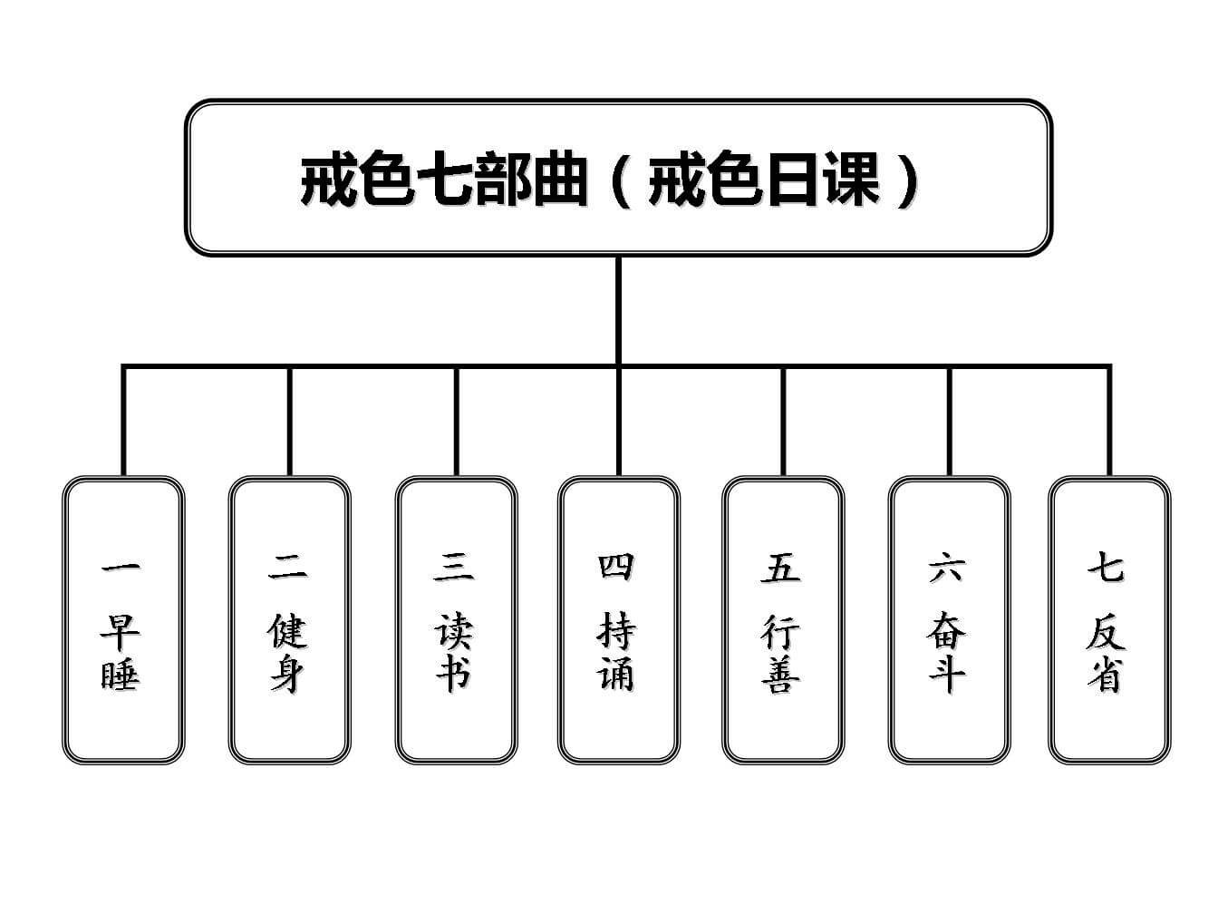 戒色,以“早睡、健身、读书、持诵、行善、奋斗、反省”七部曲做为自己的“每日必做功课”。