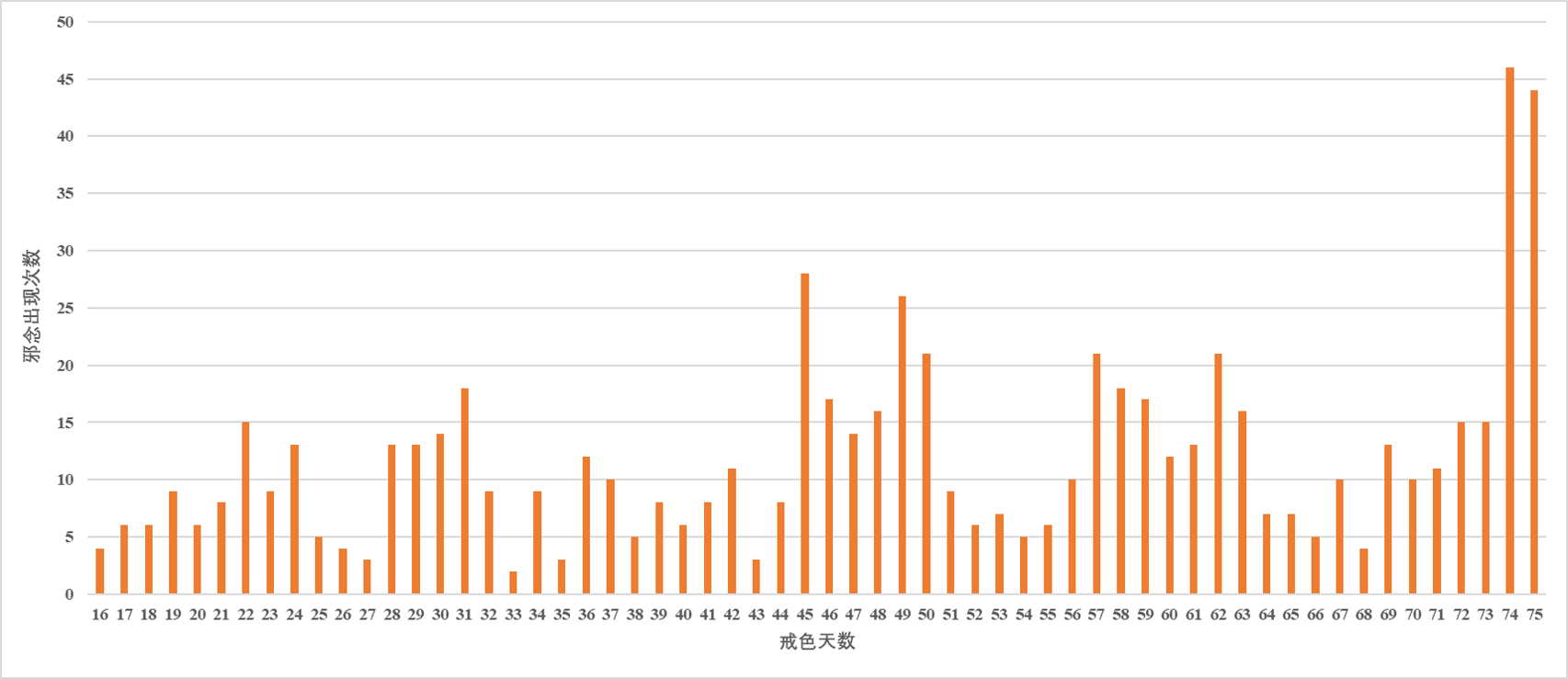 我为什么这么说呢?我还是像之前一样举我自己的例子加以说明。我想请大家先看下面这张图表。这张图表是我在一个“戒色——破戒周期”之中,对我自己每天出现的邪念数量进行的统计。为了做这次统计,在那一段时间,我随身揣着一个小本和一支笔,只要出现一次邪念,我就将它断掉,然后拿出本来记下出现邪念的时间,然后每天统计总数。首先我发现,在一天之内,邪念随时都有可能出现,从时间上找不出任何规律,分布非常分散,所以我在此并没有把它画成图,而只是画出了每天统计的总数。第二个规律,就是在我第75天破戒之前,中间出现了若干个小高峰(最高可达到一天20余次邪念,而低谷时期却在10次以下)。而在第74和75天(破戒高峰期),连续出现了恐怖的大高峰!第74天的邪念数量直逼50次,是之前小高峰的两倍。而更可怕的是,在第75天下午破戒之前,半天的时间邪念的数量已经达到了将近50次。考虑到这50余次的分布,不是完全均匀的,而是分段集中的,可以想见,在最夸张的时段,意淫的频率可能高达每1-2分钟就有一次!(大家可以回想一下自己以前每次破戒的当天是不是遇到了这种情况)
