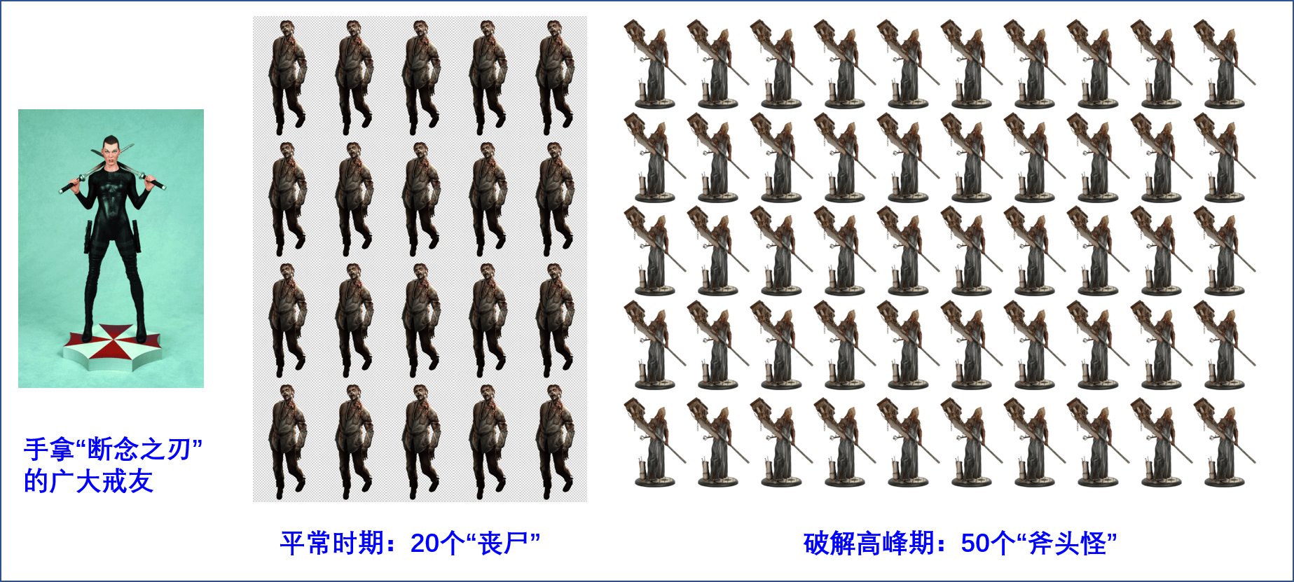 我知道“不能立刻将其断除”这句话会引发很多的争议和质疑,因为飞翔老师在《戒为良药》中提倡的就是要用断意淫口诀反复练习断念,磨砺断念之刃,做到瞬间觉察,一击必杀,不让邪念停留。可是我在这里打一个比方来说明为什么我们很难做到这一点。“生化危机”这一系列的游戏或者电影很多戒友都非常熟悉。丧尸对你扑过来时,你必须将其“爆头”,才能杀死。丧尸就像是邪念,我们就像是苦练枪法和刀法的主角,随时准备“秒杀”来犯的丧尸。可是,对于平常时期来犯的普通丧尸,我们可以轻松地一枪一个,全都放倒。在破戒高峰期时,虽然还是可以凭借我们熟练的断念之法,瞬杀大部分念头,可是第二类“微妙感觉”总是会不时地出现。因为这种性冲动非常飘渺,不是念头,很难做到第一时间觉察,在“微妙感觉”(性冲动)萦绕在我们脑子里时,这时出现的念头,全都是“强化”过的念头,就像是从普通的丧尸变成了那种非常难缠,杀伤力极大的斧头怪。
