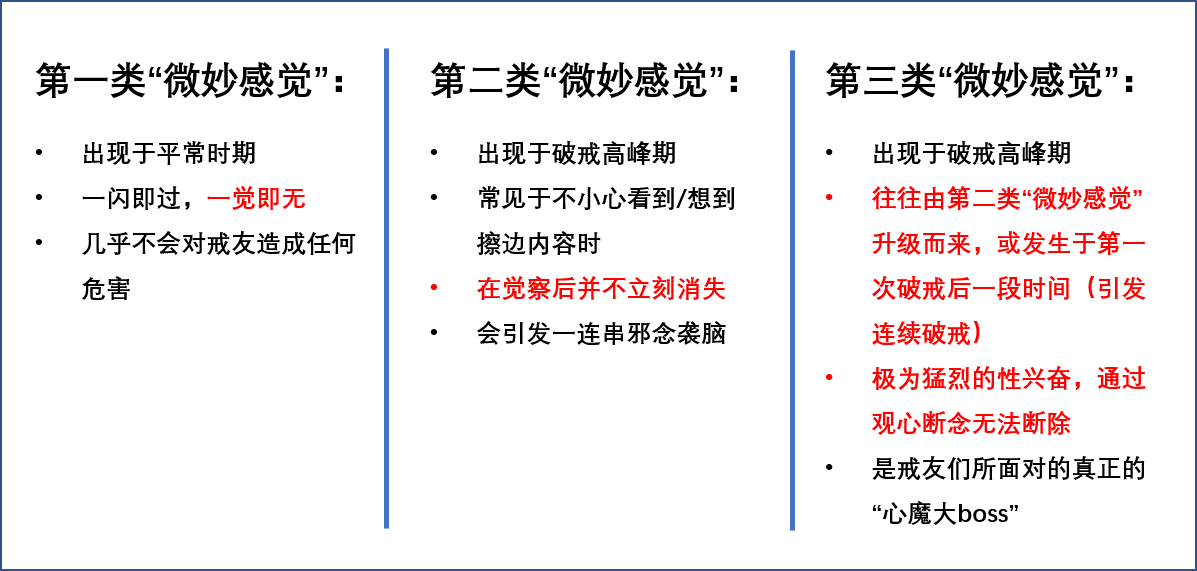 “微妙感觉”是戒友们对这一种神经感受的形容,其实更准确地讲,它是一种性兴奋,或者说是性冲动。“微妙感觉”(性冲动)也分很多种(见下图),最轻微的一种就像普通的念头一样,一觉即无。这一类“微妙感觉”(性冲动)往往对我们造成不了任何危害。相反,我们要重点提防的是另外两种“微妙感觉”(性冲动),从强度上来讲,后面两种“微妙感觉”比前一类要增强很多,它最明显的特征就是——你一觉的时候,不能立刻将其断除。老戒友谈:你为什么戒不掉(三)