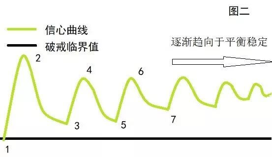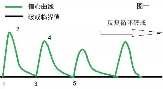首先,图1代表的是那些戒友在戒后多次犯戒的情况。我们用绿线表示节欲后的信心变化,黑色直线表示破戒临界值。