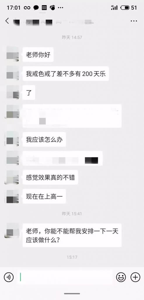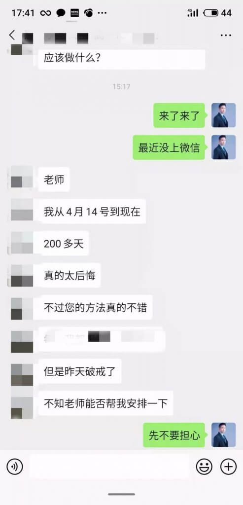 他一直很有礼貌,执行力也强,是我比较喜欢的一个学员。他按照我教的方法,每天都好好去执行,算是戒的还比较顺利。