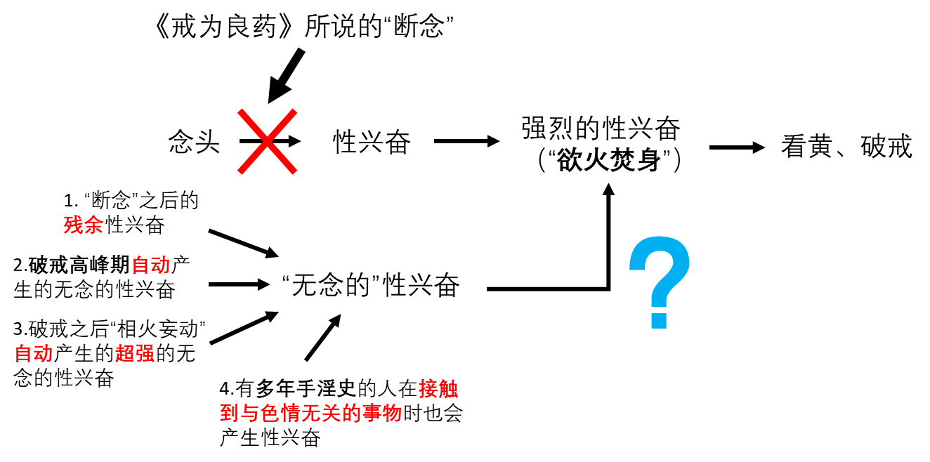 而为什么那么多的戒友,拼命地练习观心断念,却还是一而再、再而三地败给心魔呢?原因就在这张示意图里!导致你破戒的原因,看上去貌似是“断念失败”,而其实并不是!真正导致你破戒的原因是强烈的性兴奋,也就是类似于“毒瘾发作”一样的,“欲火焚身”的状态。而要使你出现这种“欲火焚身”的状态,并不是仅仅只能通过念头!通过其它的途径,你一样也会出现这种状态!