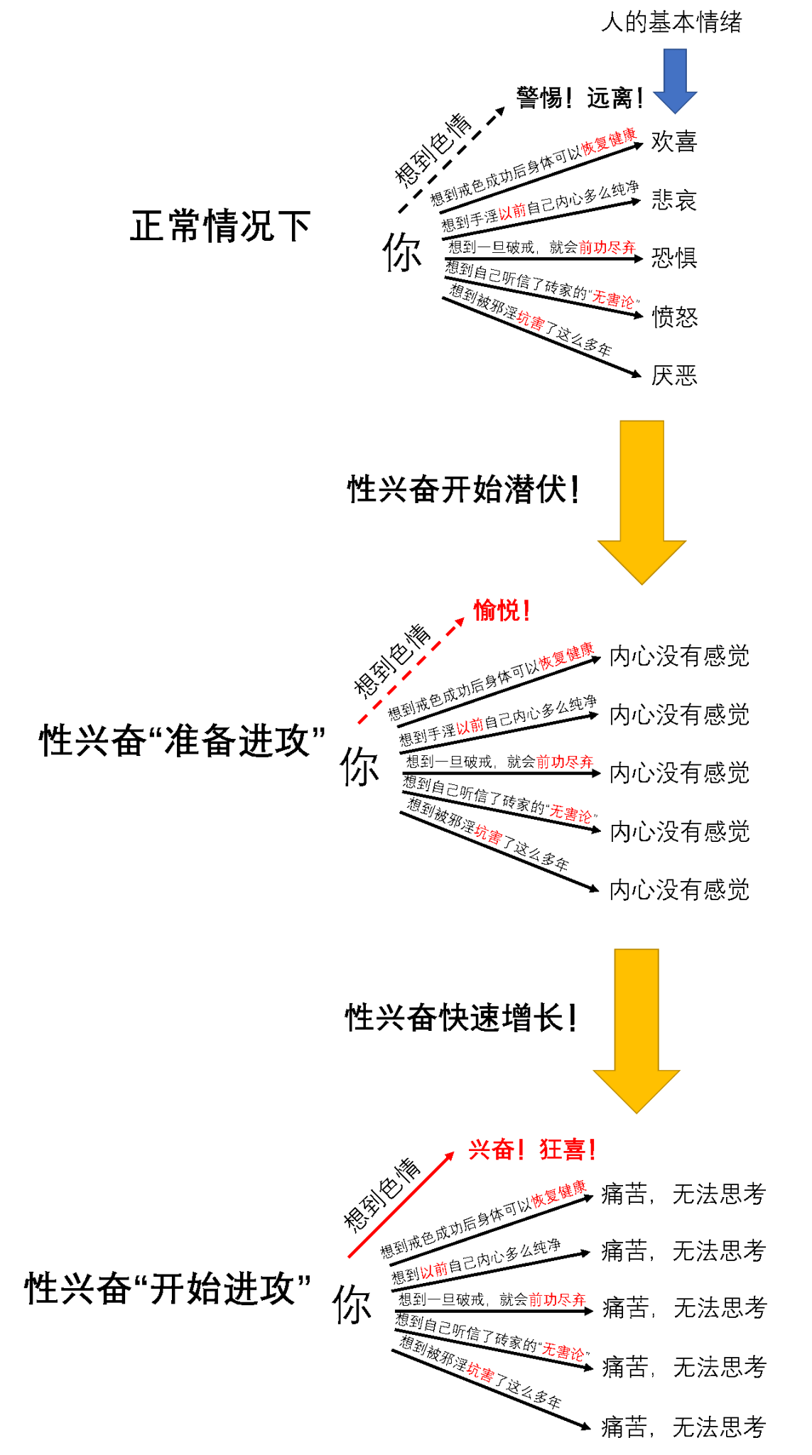 我举这个例子,就是在教给大家如何预判性兴奋是否很快要对你发动攻击。请你在想到“邪淫“,想到”破戒“的时候,仔细检视一下自己的感受是否正确。如果你感觉那种“恐惧”“厌恶”和“愤怒”变得不那么明显了,请你千万不要忽视这个信号,这是性兴奋开始攻击的“前兆”。请你想办法把自己的警惕心重新提起来,因为一旦性兴奋开始进攻,这些“无感”的想法,就会进一步升级为极度的折磨与痛苦(见第三张图)。而此时,只有“邪淫”的想法,才能给你带来兴奋和狂喜,为你减轻这种像毒瘾发作一样的折磨与痛苦。那时候,你难道还能忍住不去想邪淫吗?等到性兴奋增长到一定程度,你就会因为极度的痛苦而完全无法思考,完全丧失自己的理智,只能随着这种减轻痛苦的本能去看黄、手淫。心魔的根本逻辑,就是先用快感引诱你。殊不知这种虚假的快感是一体两面的,它的背面就是痛苦,你只要往“快感”的方向上迈出一步,就会堕入巨大的痛苦中,最终“邪淫”这件事反倒是变成了你减轻痛苦唯一的“救命稻草”。请大家务必深思!