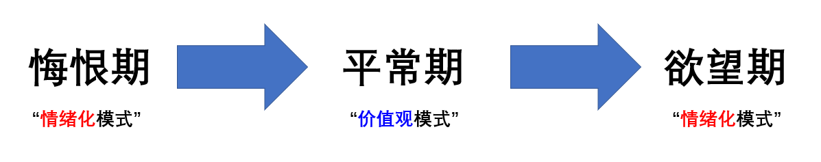 “三天打卡党”们,在破戒后有多么悔恨,在欲望高峰期里面,他们就有多么兴奋。因为他们无论是戒色还是看黄,全都是处在“情绪化模式”里的。用前面那个划船的比喻就是,脑子里刮西风的时候,行为上就往东出溜,脑子里刮东风的时候,行为上就往西出溜。在无念的性兴奋出现的时候,他们的思维会产生180度的大转弯。