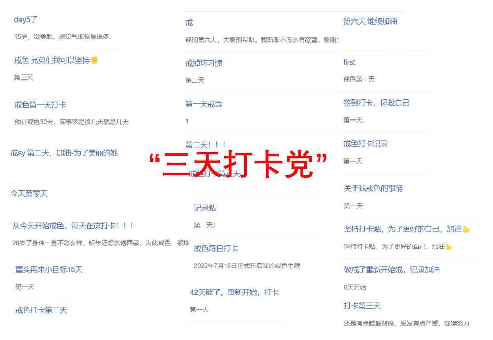 情况2:“破戒后的悔恨期”。如果你刚刚破戒,此刻我问你,你想不想看黄。你会恨不得抽自己两个嘴巴。为什么戒色吧里面的发帖,很大一部分标题和内容都是“又破戒了,戒色第一天打卡”,接下来是“戒色第二天打卡”,“第三天打卡”,再之后这个人就不再来打卡了,直到过了几天又冒出一个“又破戒了,第一天打卡,这次一定戒掉”。他所谓的“打卡”只能持续个三五天,因为在这三五天里面,他是在处在一种悔恨的“情绪化模式”里面的。这种悔恨的情绪,会在他们的大脑里面“放大”性的反面意义,而“缩小”性的正面意义。(你不能否认性的正面意义,它存在,而且它大到不可忽略。)在这一段时间里,他们一想到性,就是痛恨。但是随着时间的推移,这种情绪会逐渐减弱直到消失,恢复到“冷静的价值观”模式。这个时候他们就不再打卡了。这些人,我虽然很同情他们,我花自己的时间精力去写《老戒友谈》,写了七万字,免费给大家看,免费给大家答疑,也是为了帮助他们,但是我这里要给这一类戒友起一个外号,叫做“三天打卡党”。