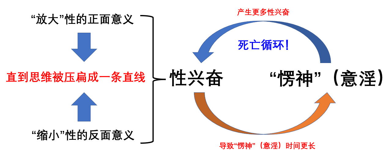 随着这些“愣神”时出现的画面进一步调动你的气血向脑袋上冲,情况会进一步恶化,你每次“断念”(也就是回神)之后,都会几乎立刻重新进入“愣神”状态,因为你无法调动脑力,所以你现在也无法思考要怎么做,甚至连离开房间都做不到。你只是不断地在“愣神”(意淫)与“回神”(断念)之间反复,而每次愣神的周期会变得越来越长,直到你完全陷入满脑子意淫的状态,这个时候就是大脑“被欲望完全控制”的状态,也是你完全失去自由意志,沦为心魔奴隶的时刻。接下来发生的就是千篇一律的“看黄→破戒→悔恨”循环。